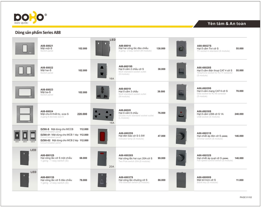 Công tắc, ổ cắm DoBo A88 Series. BH 05 năm.