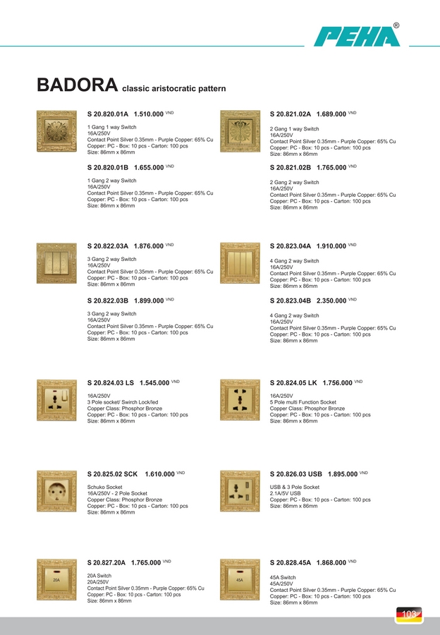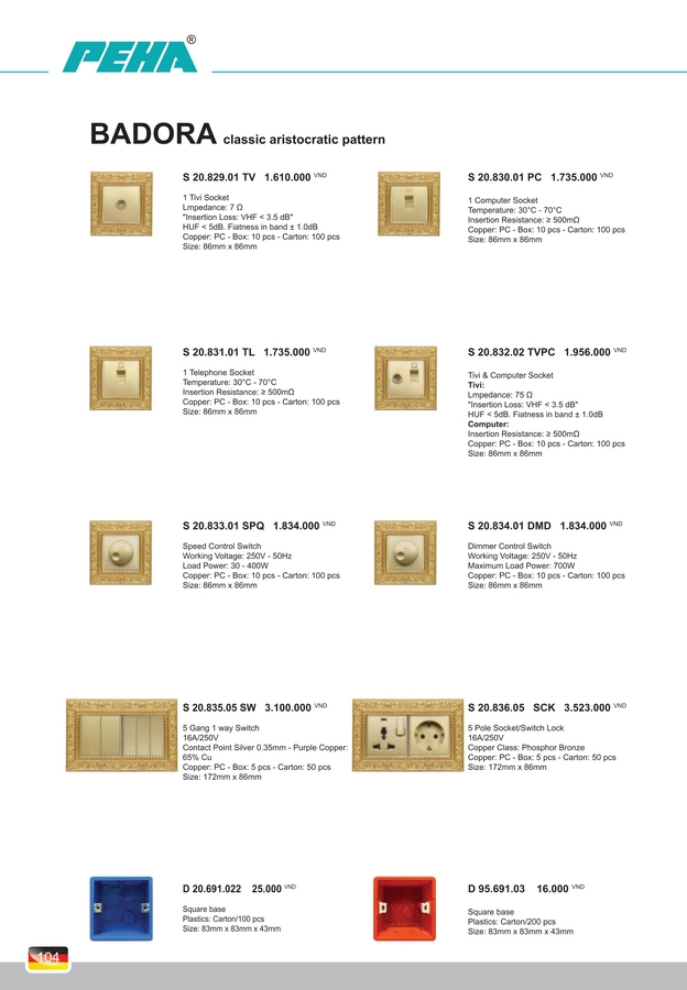 Trang chủ » THIẾT BỊ ĐIỆN » Peha » Công tắc, Ổ cắm PEHA BADORA (Classic aristocratic pattern). BH 10 năm.